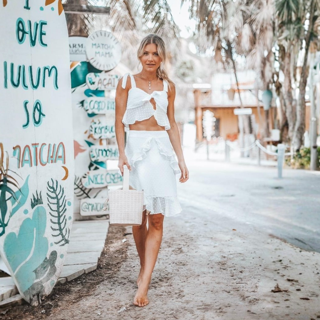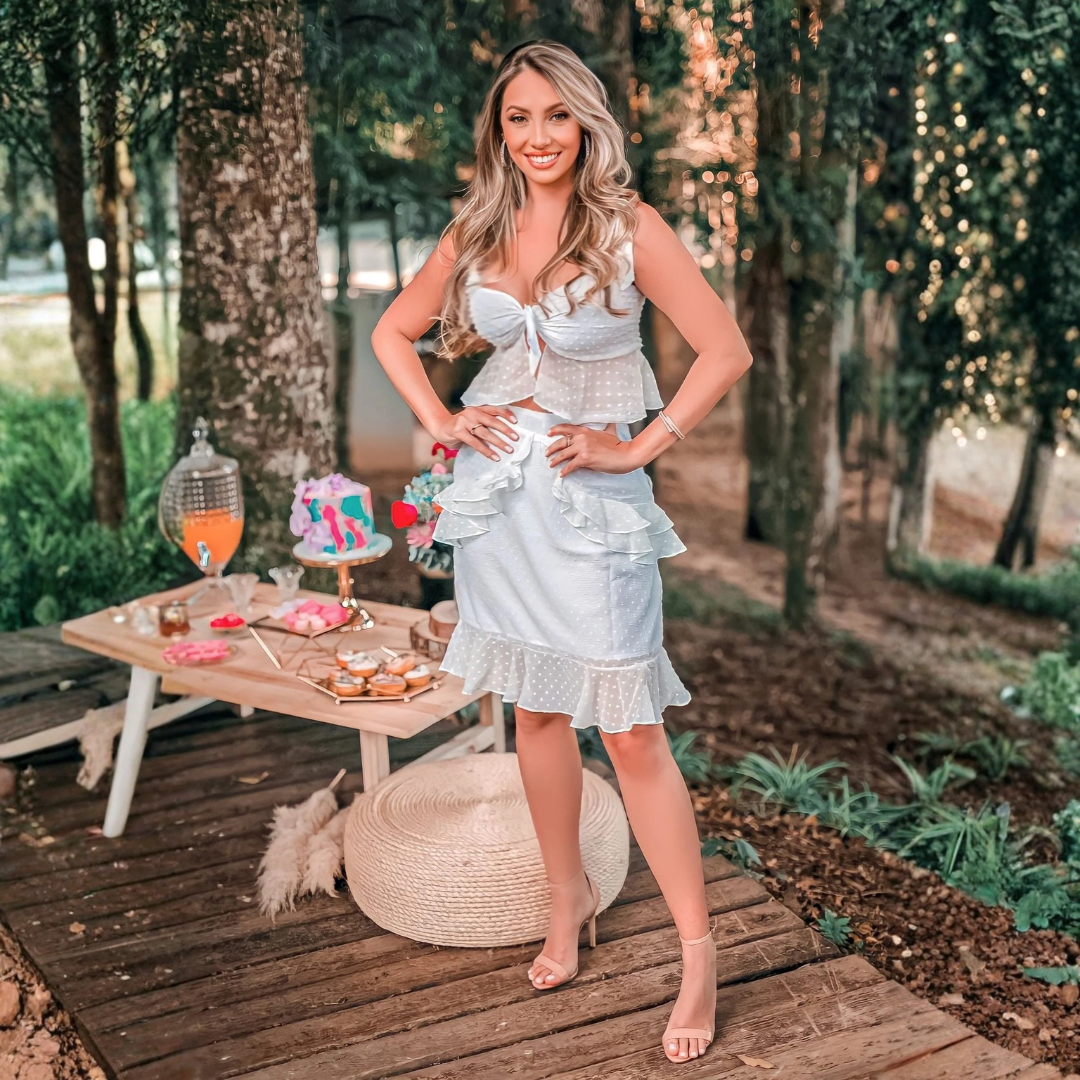 Saia curta com babados no quadril e na barra. Fechamento por zíper na lateral.
